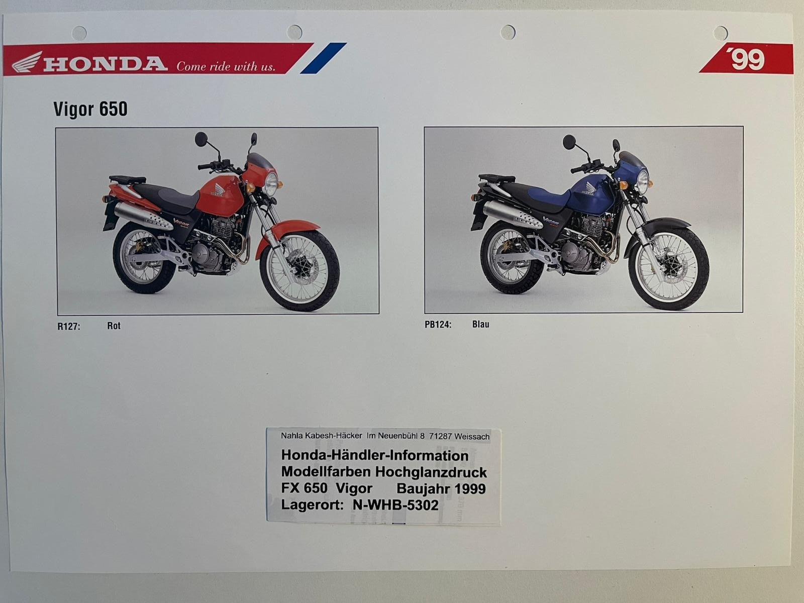 FX650 FX 650 Vigor Baujahr 1999 - Honda Original Farbchart Prospekt
